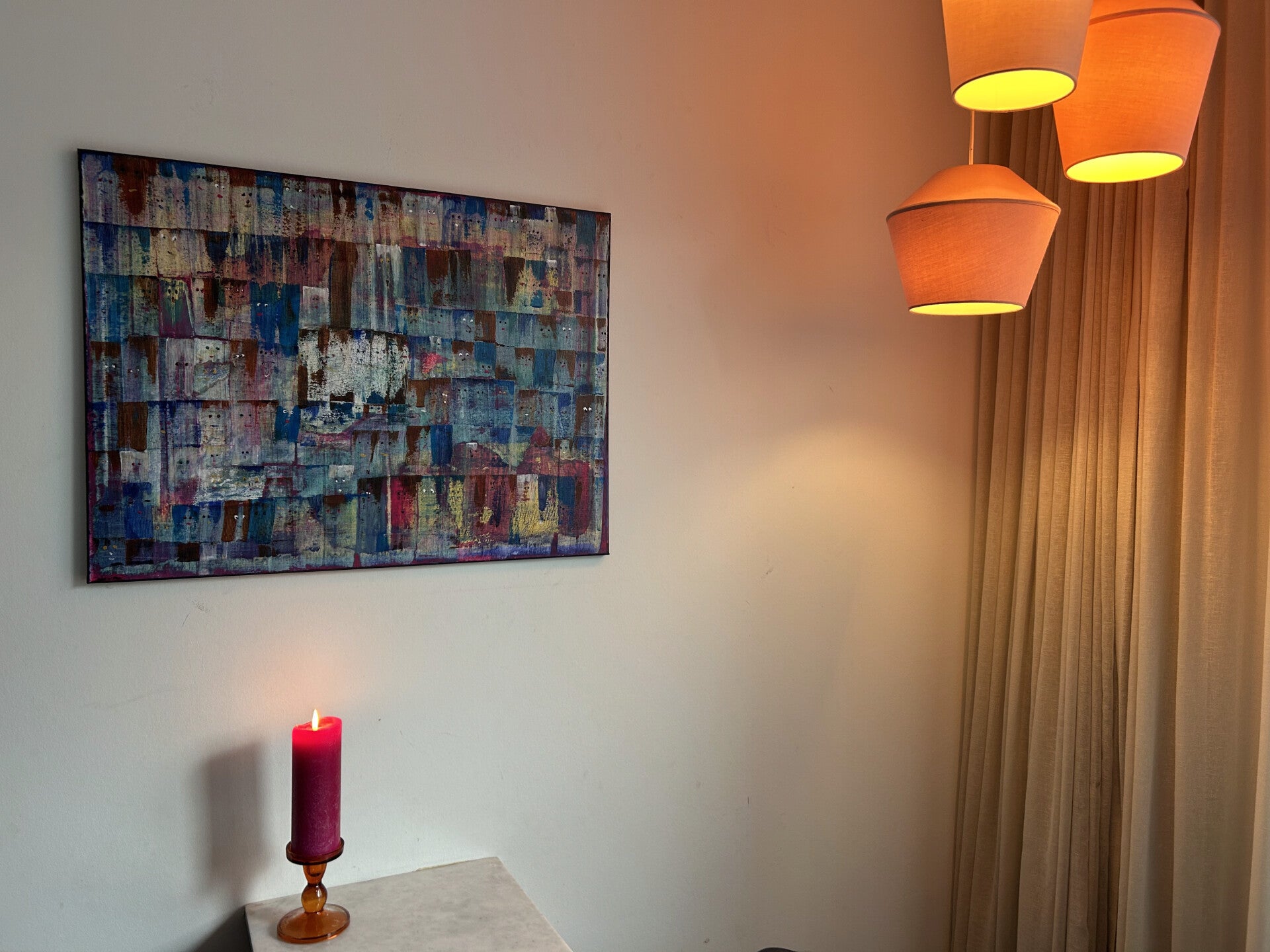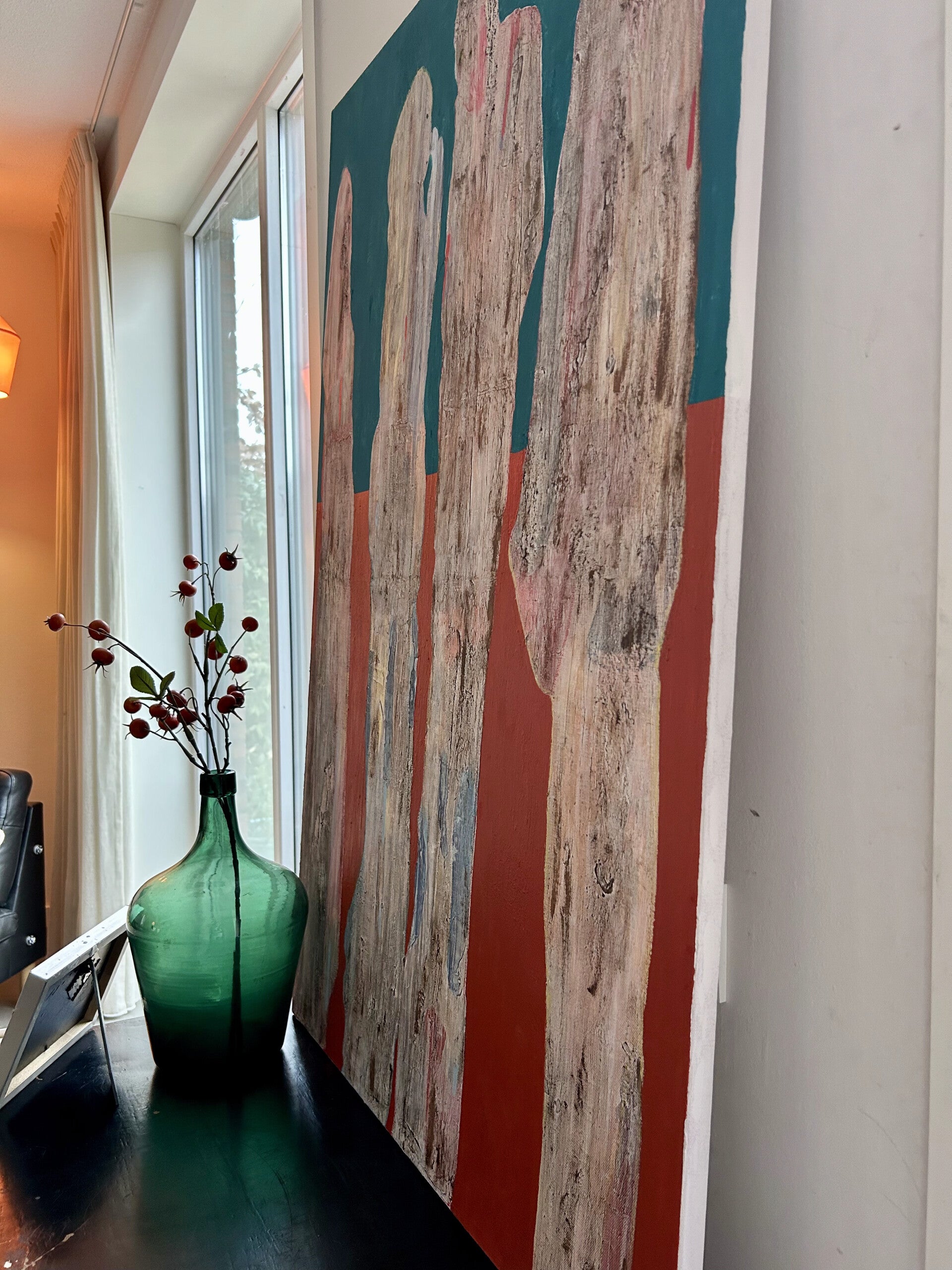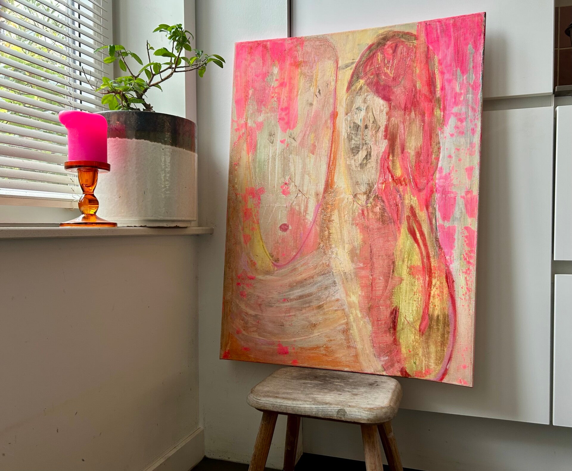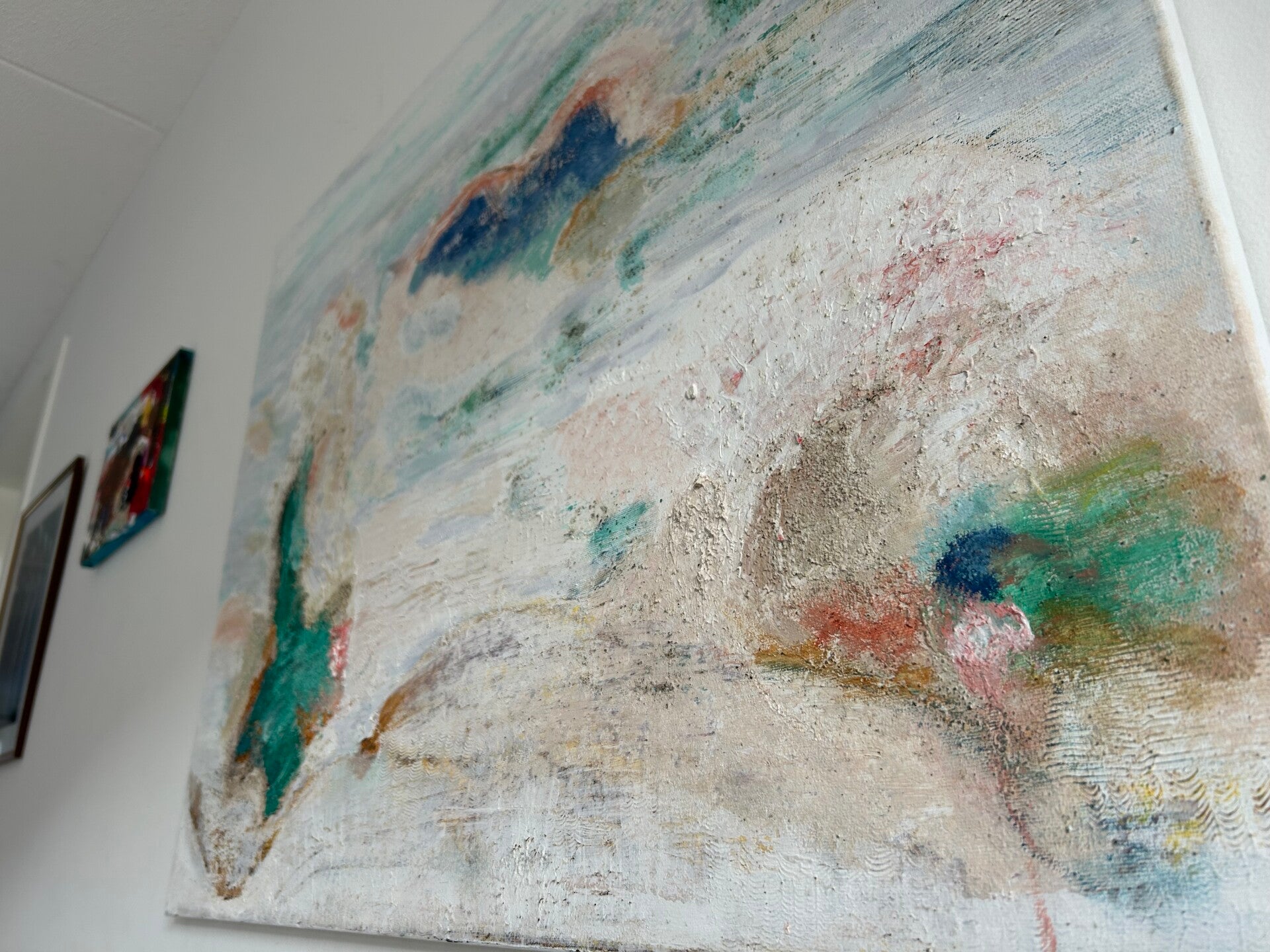 Foto's 'aan de muur' vind je wanneer je verder naar beneden scrollt. Onderaan deze pagina vertel ik je tot slot meer over mijn manier van werken, over wat ik tegenkom wanneer ik schilder. Neem voor meer info of bij interesse gerust contact met mij op