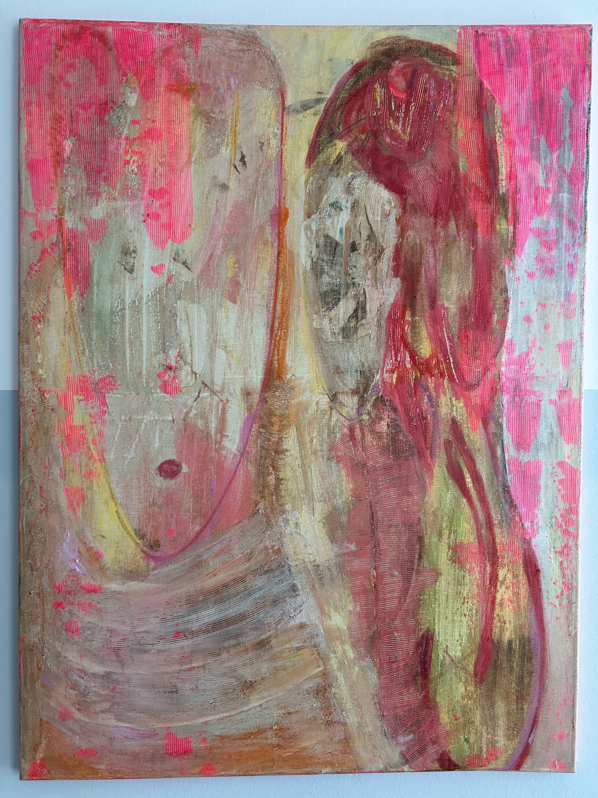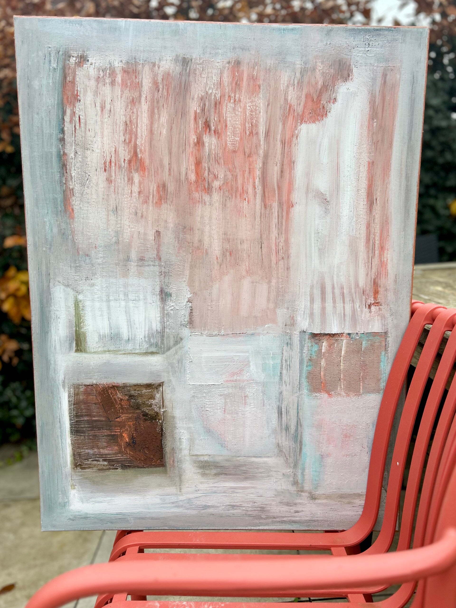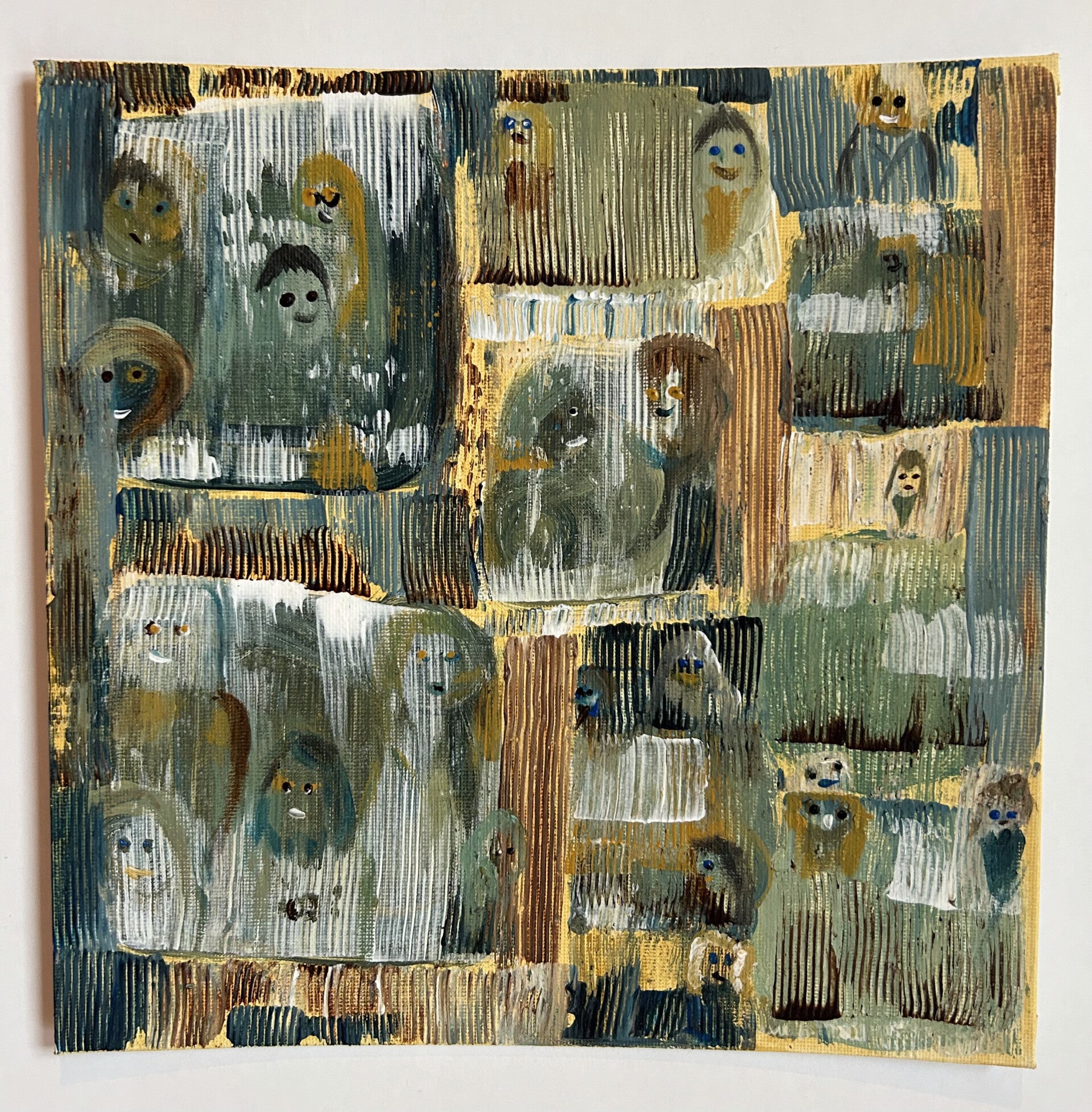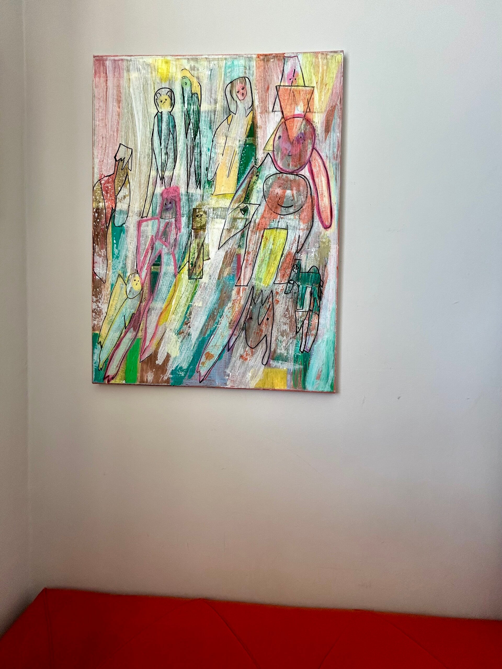 Zien & gezien worden. Jezelf leren kennen via anderen. Inleving en empathie. 'We laveren door het leven, samen en alleen.' Net als in mijn schrijven, is er sprake van een lichte toon. Door gebruik van toegankelijke kleuren, in een sfeer van gezelligheid, ook al speelt er regelmatig een dynamiek van wel of niet in contact willen of kunnen zijn, van escapisme, vervreemding zelfs. Toch blijft het veilig om naar te kijken. Door de regelmatige keuze voor wit en lichte kleuren, weliswaar soms met schurende structuurlagen aangebracht.