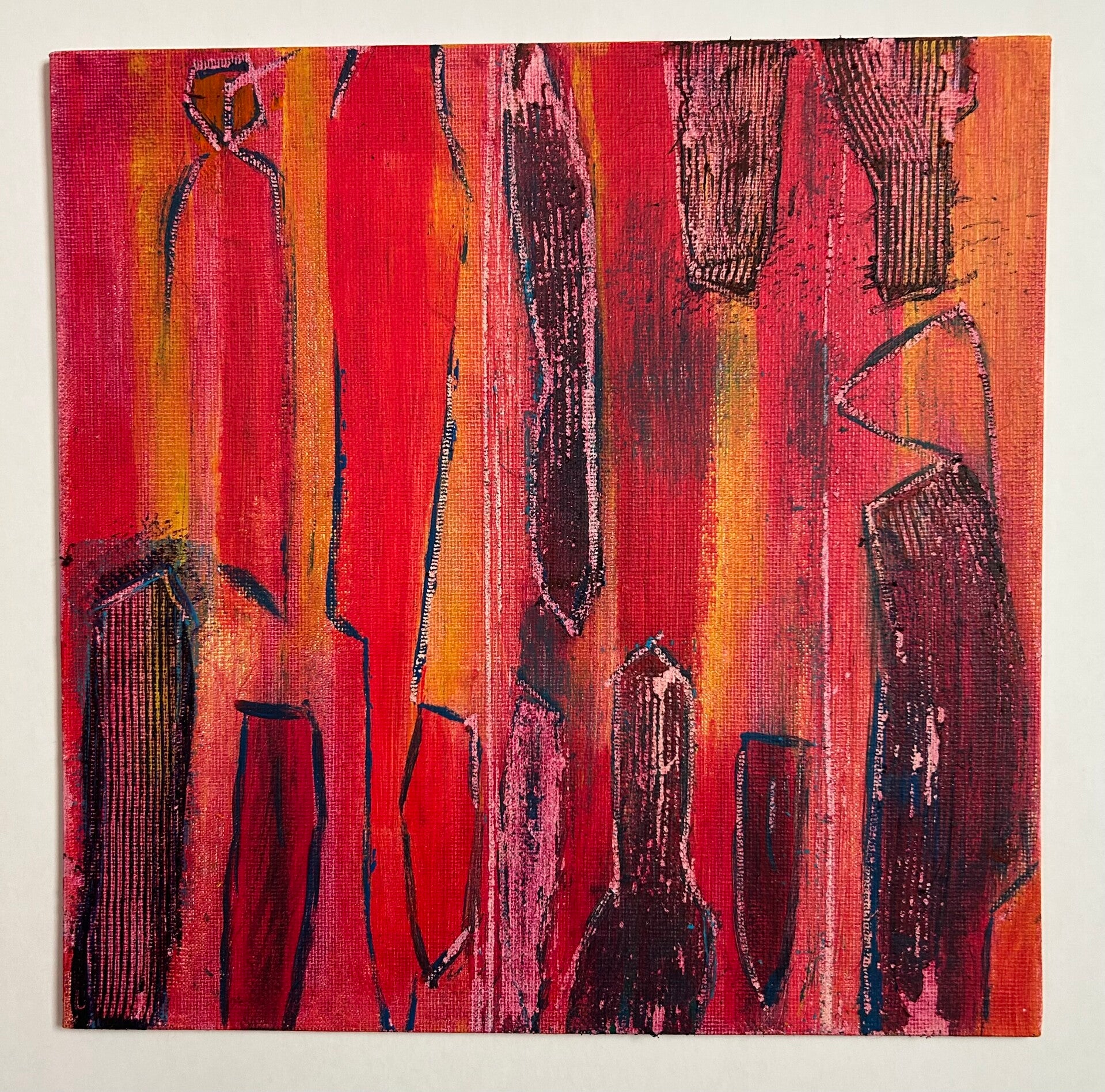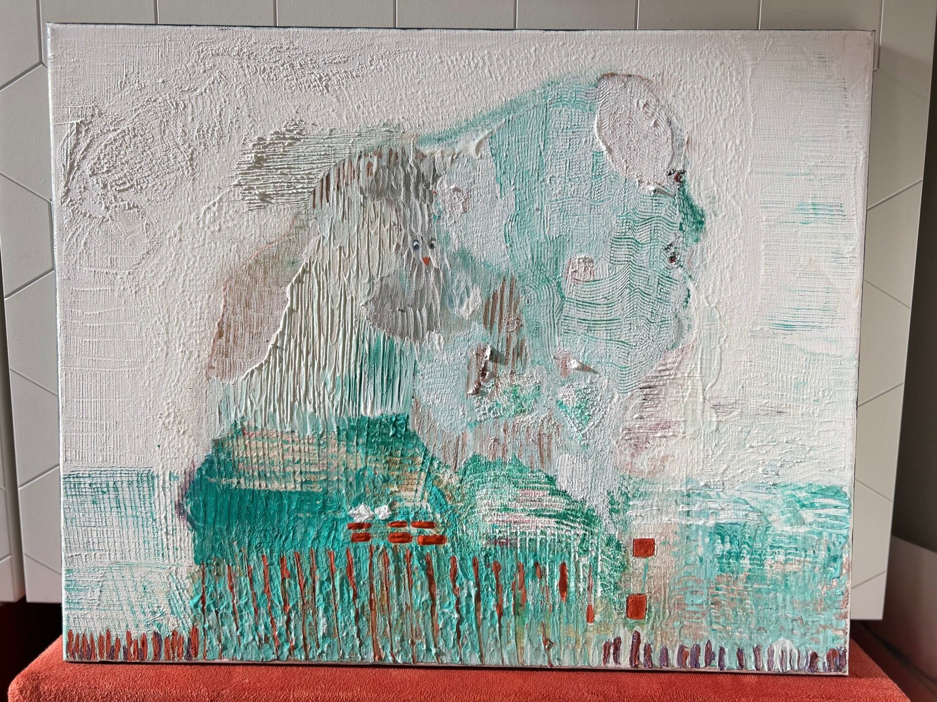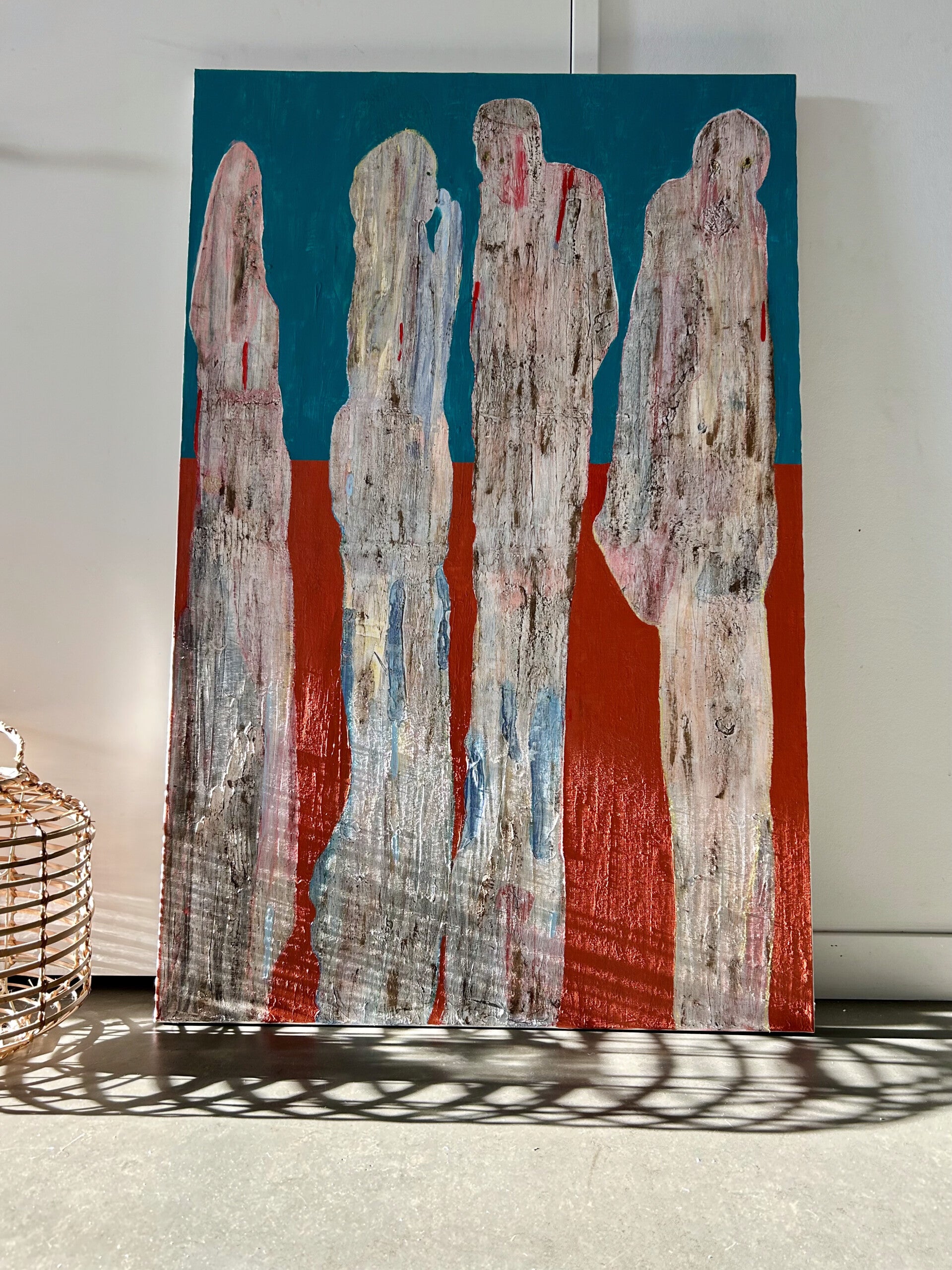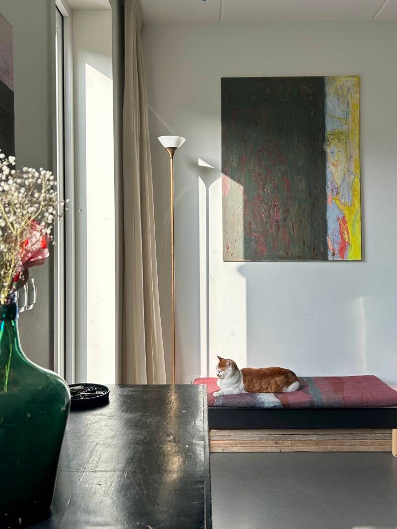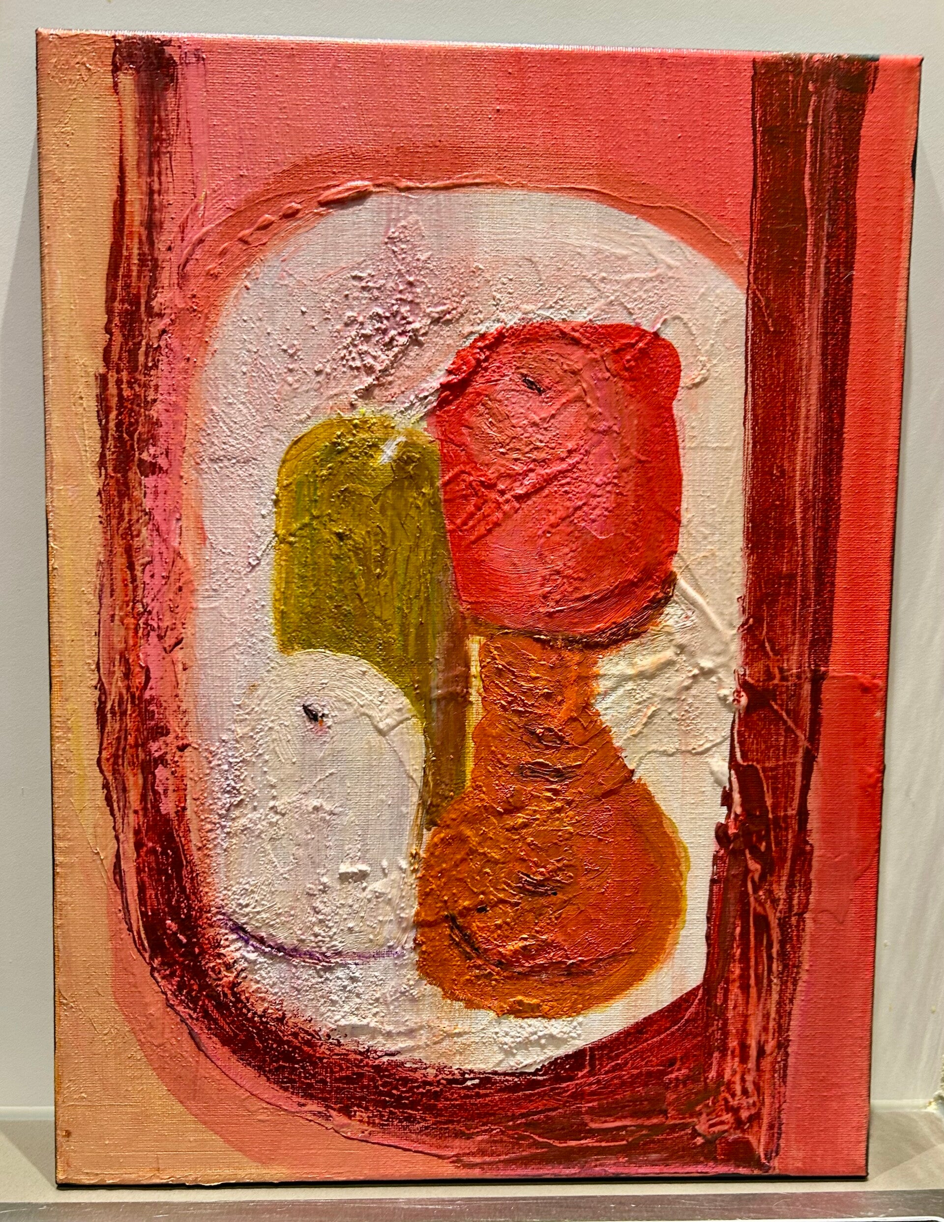 Zien & gezien worden. Jezelf leren kennen via anderen. Inleving en empathie. 'We laveren door het leven, samen en alleen.' Net als in mijn schrijven, is er sprake van een lichte toon. Door gebruik van toegankelijke kleuren, in een sfeer van gezelligheid, ook al speelt er regelmatig een dynamiek van wel of niet in contact willen of kunnen zijn, van escapisme, vervreemding zelfs. Toch blijft het veilig om naar te kijken. Door de regelmatige keuze voor wit en lichte kleuren, weliswaar soms met schurende structuurlagen aangebracht.